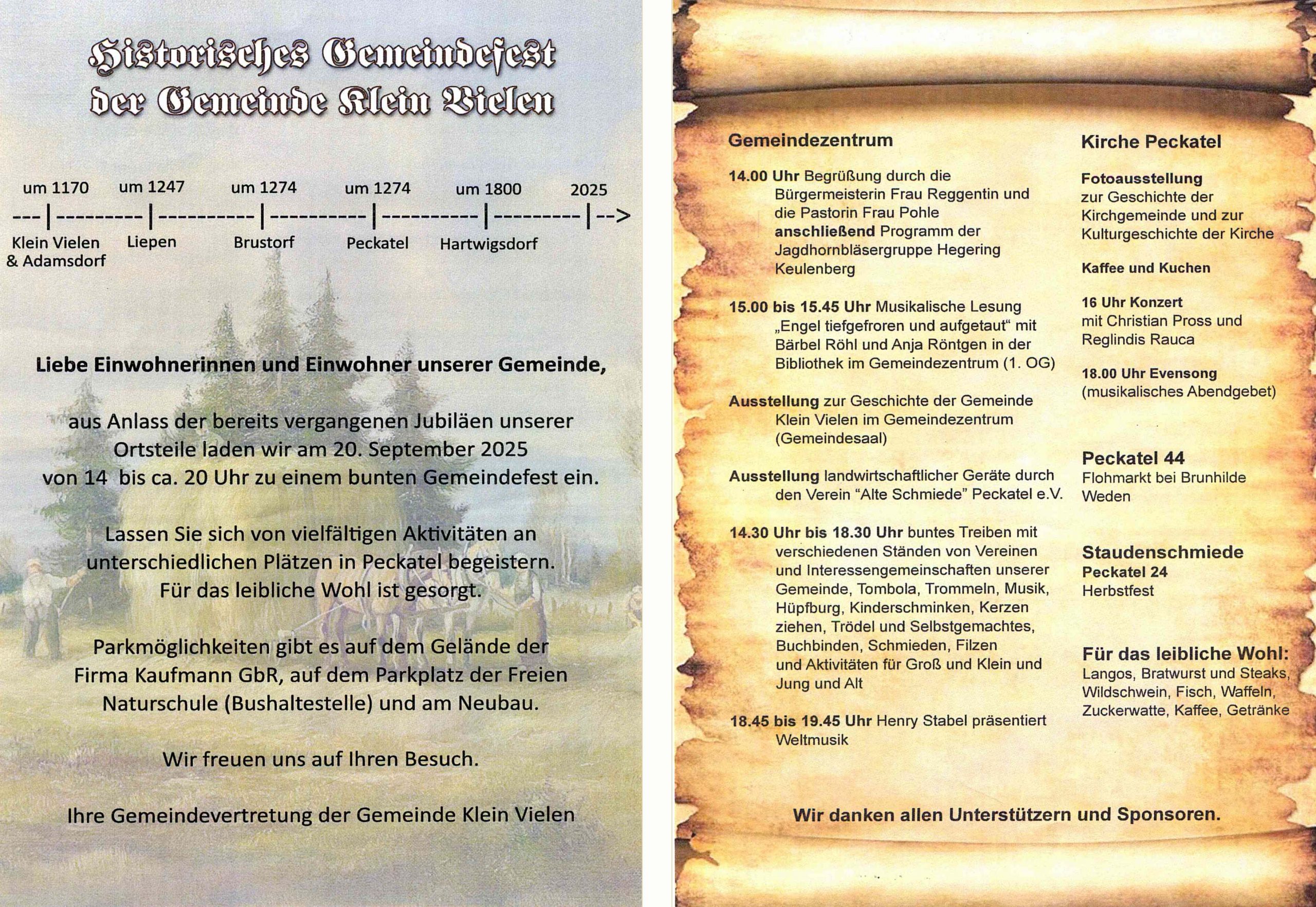 Nun aber möchte die Gemeinde die beiden Jubiläen gebührend feiern, und zwar am Sonnabend, den 20. September 2025. Es soll ein buntes Gemeindefest werden, zu dem verschiedene Akteure der Gemeinde beitragen, so Ulrike Gürtler mit ihrem traditionellen Staudenfest, die Kirchgemeinde Peckatel, der Klein Vielen e. V. oder der Verein „Alte Schmiede“ Peckatel. Musikalische Beiträge liefern die Jagdhornbläsergruppe des Hegerings Keulenberg, Henry Stabel mit Weltmusik, hinzu kommt eine Lesung mit Bärbel Röhl und Anja Röntgen. Auch für Kinder wird etwas geboten. Aber schauen Sie in das hier abgebildete Programm.